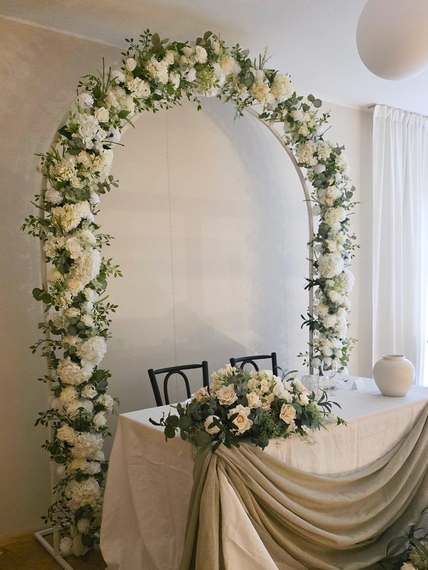 Korkeus n 2.4 m, halkaisija n. 2 m - kevyt vihreä-valkoinen/luonnonvalkoinen kukitus - 1 kpl - vuokrahinta 220 €